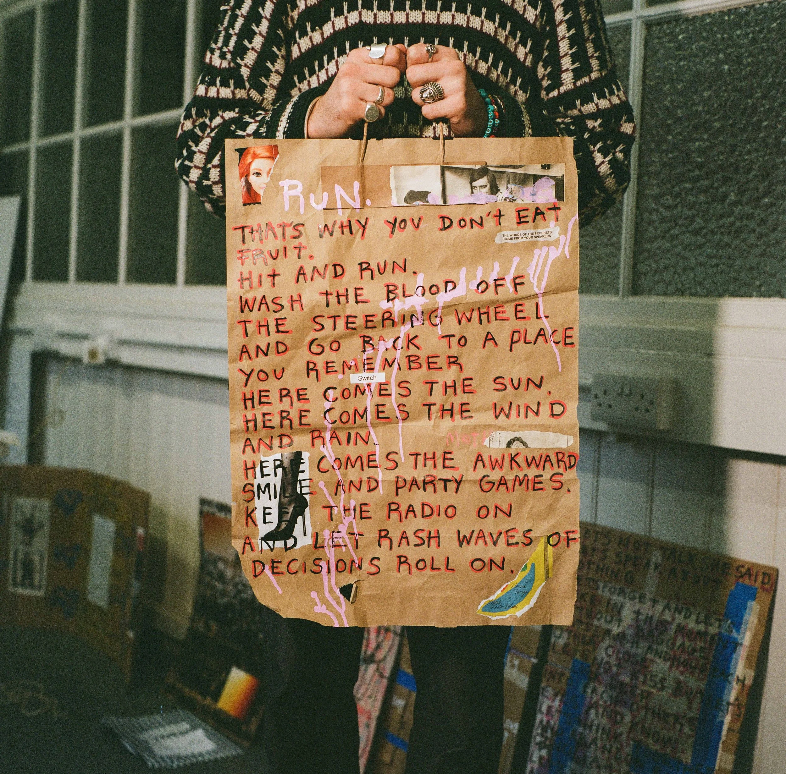 Dogwasher writes poems and makes art pieces from using recycled materials. Stuff from his life like receipts, sweet wrappers and cut outs from magazines and cardboard boxes. His main goal is to bring his poetry out of his sketchbook and let it interact again with the things which inspired it, the fallout from life.